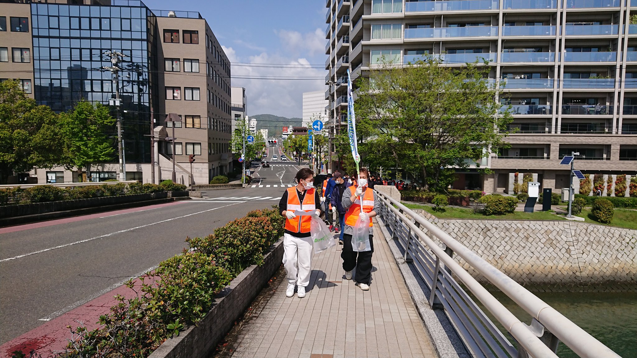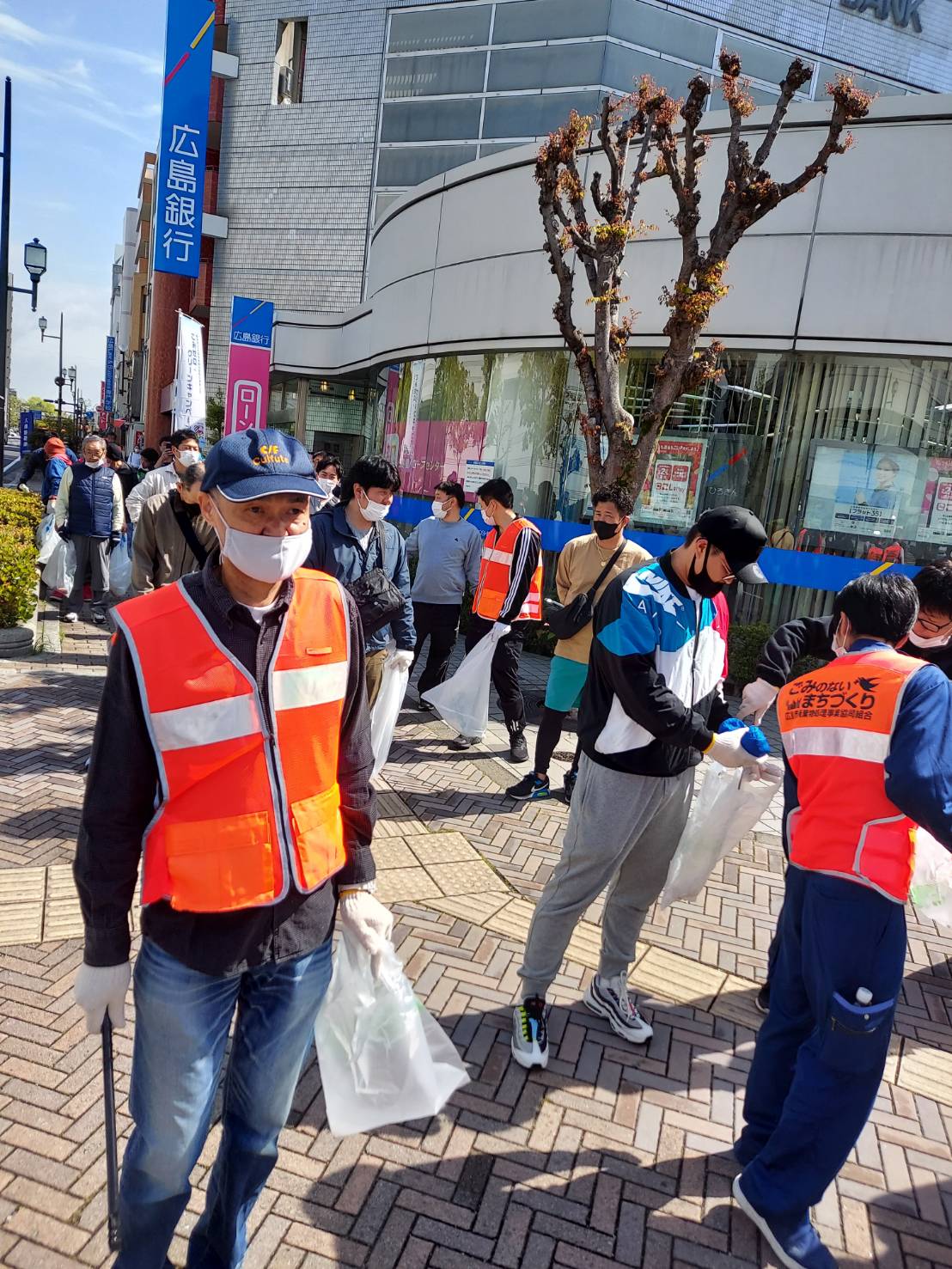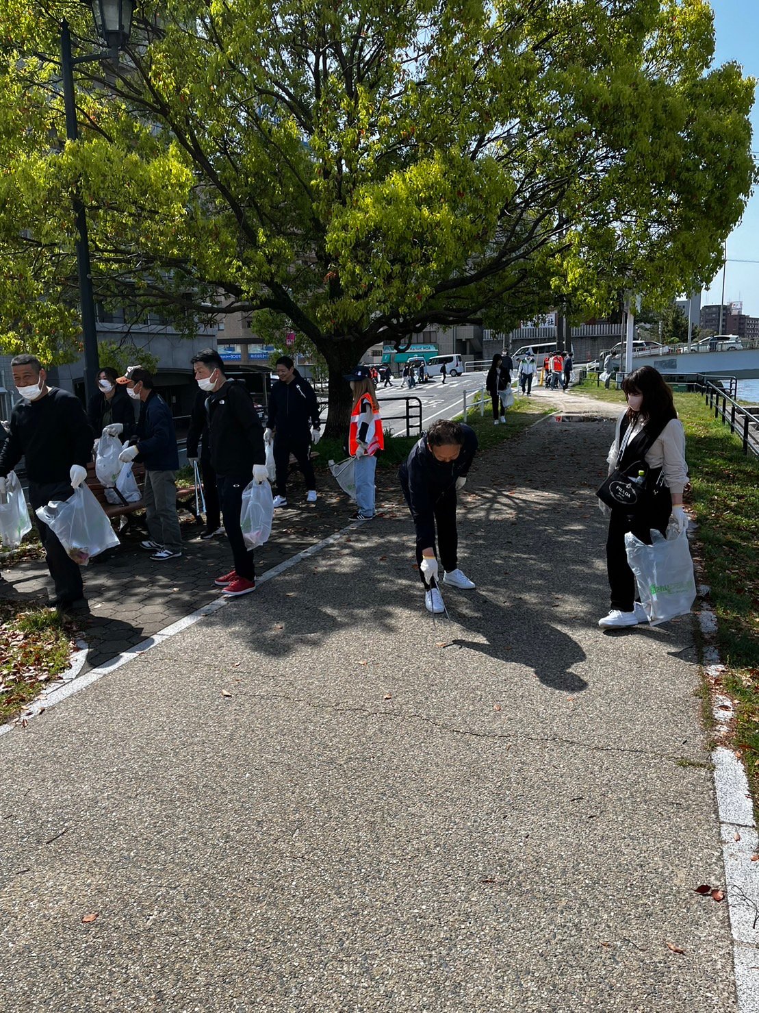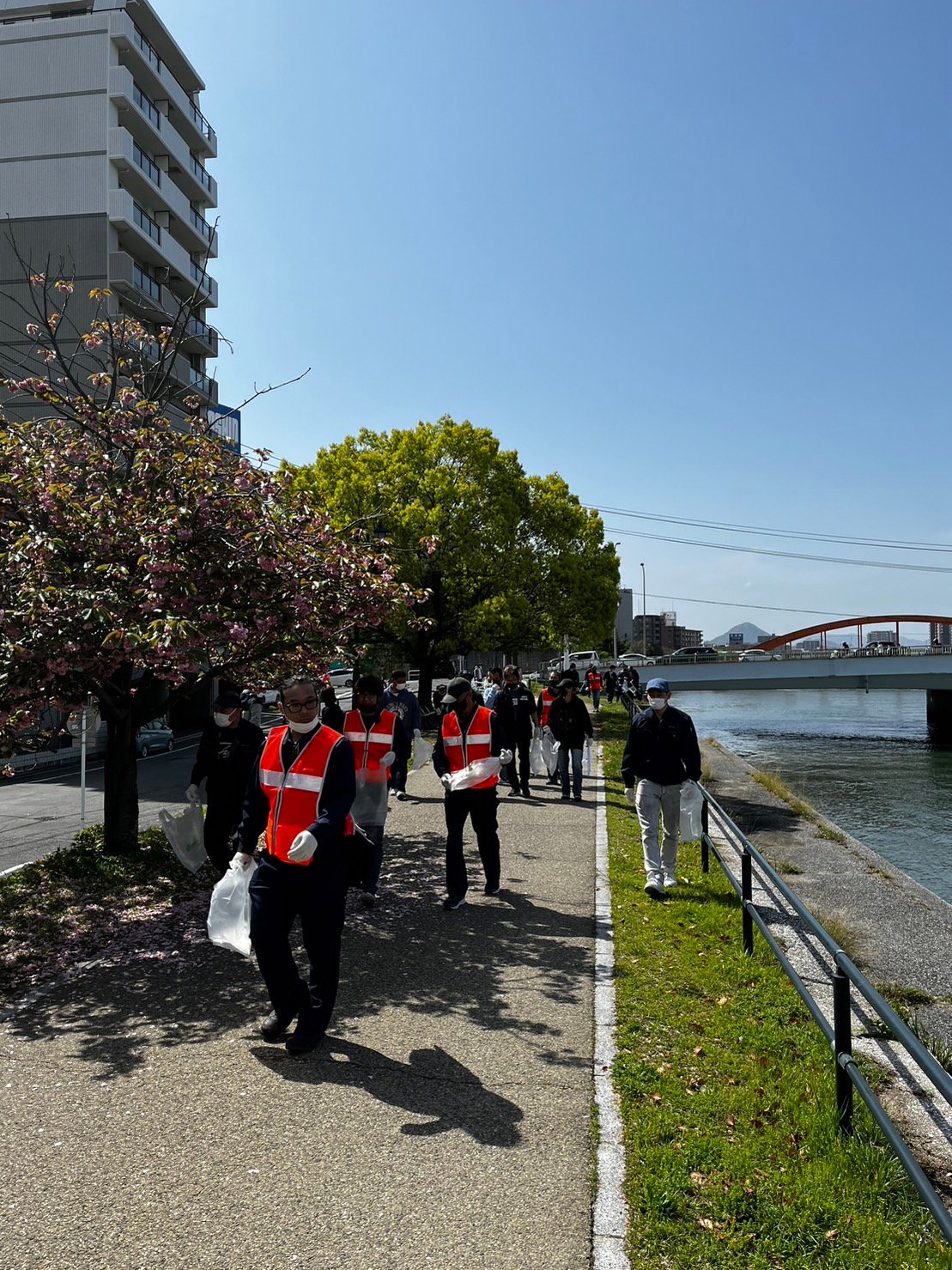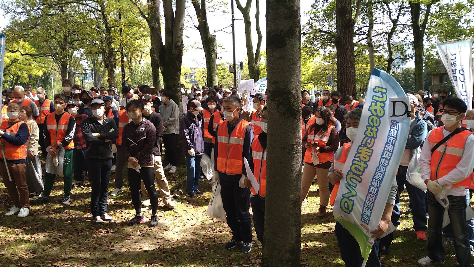 心地よく過ごしていただけるよう平和公園前の緑地帯、吉島通り、元安川の川土手を総勢300人の組合員の方々が4コースに分かれて清掃活動を行いました