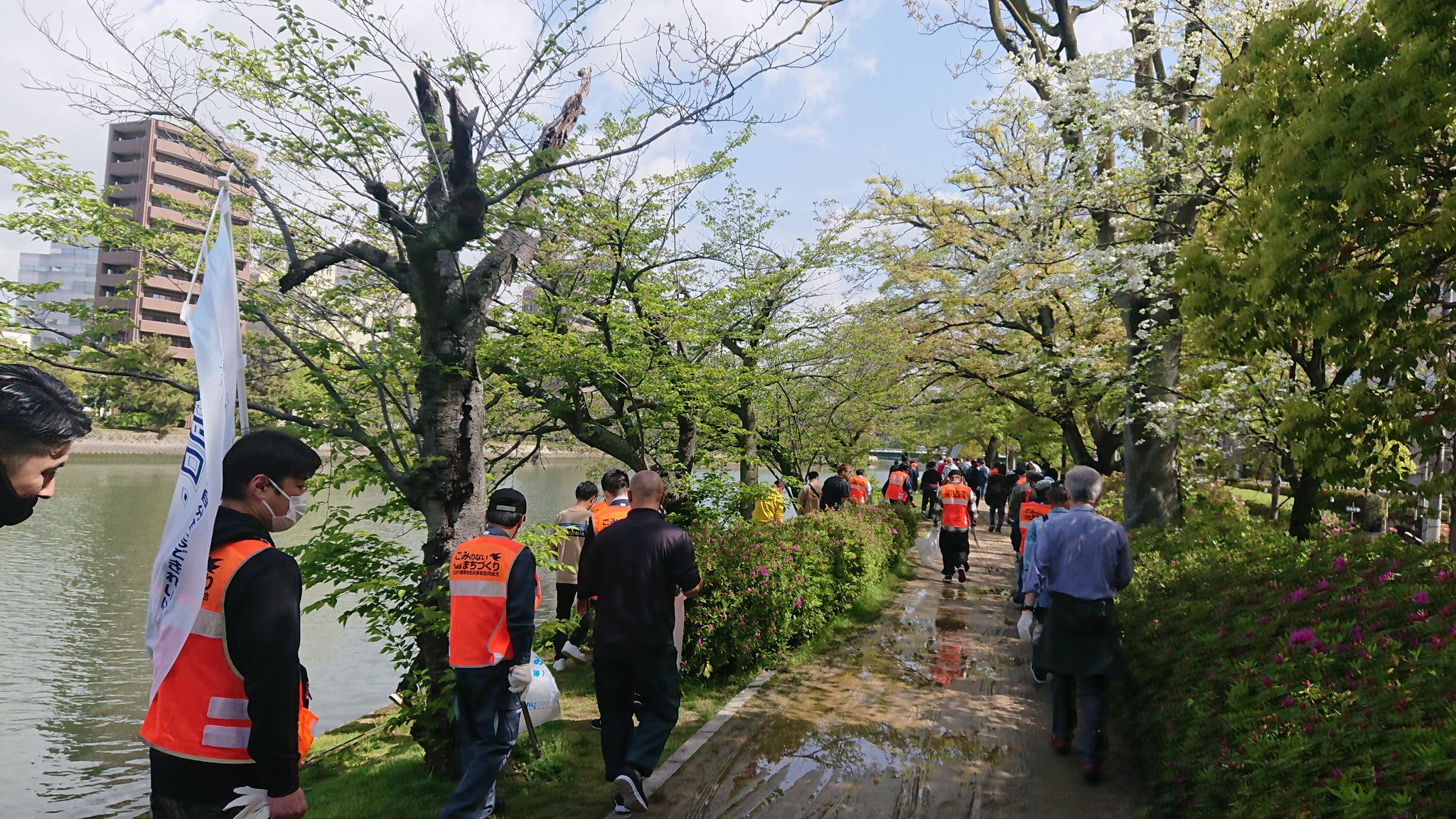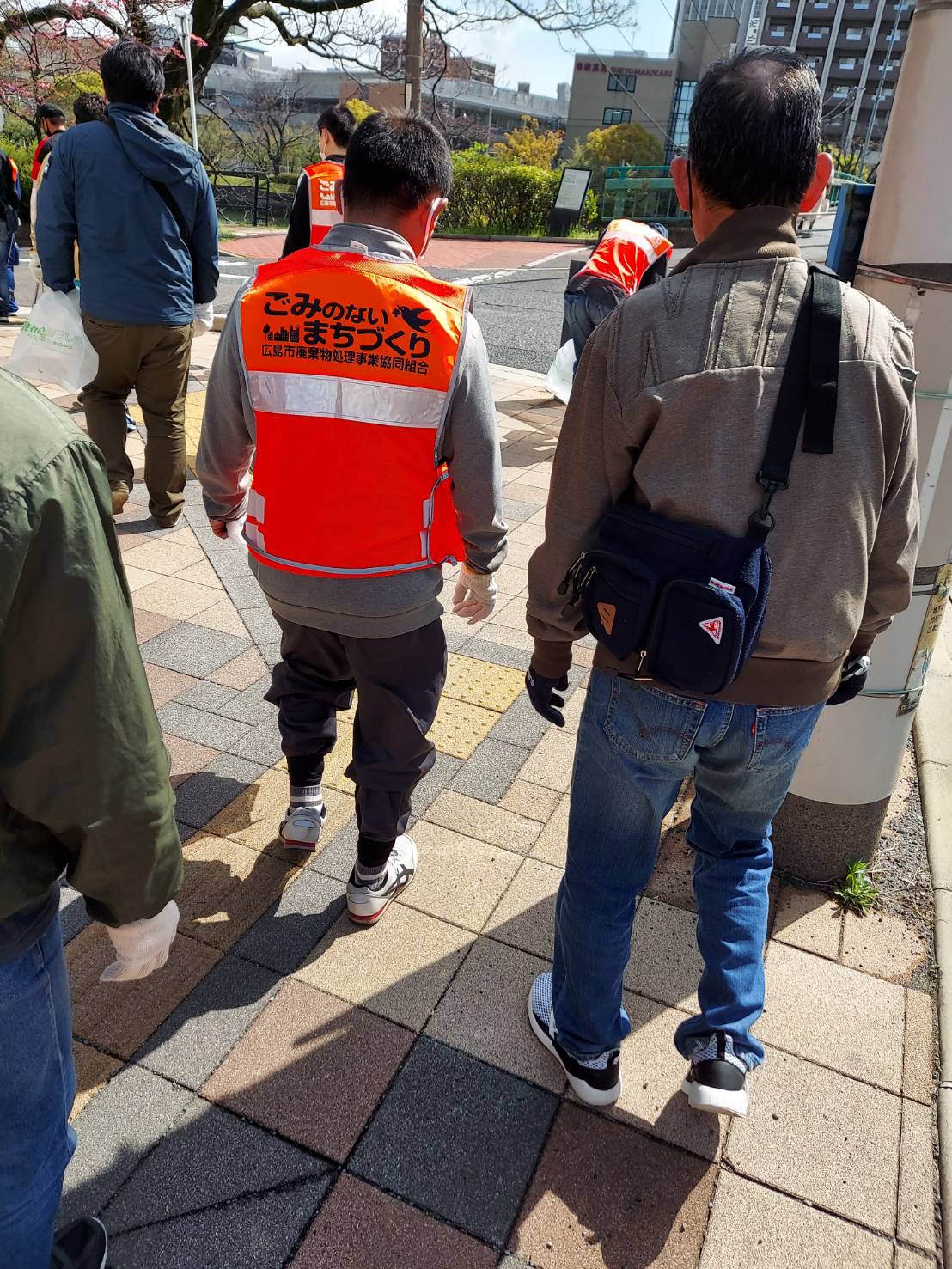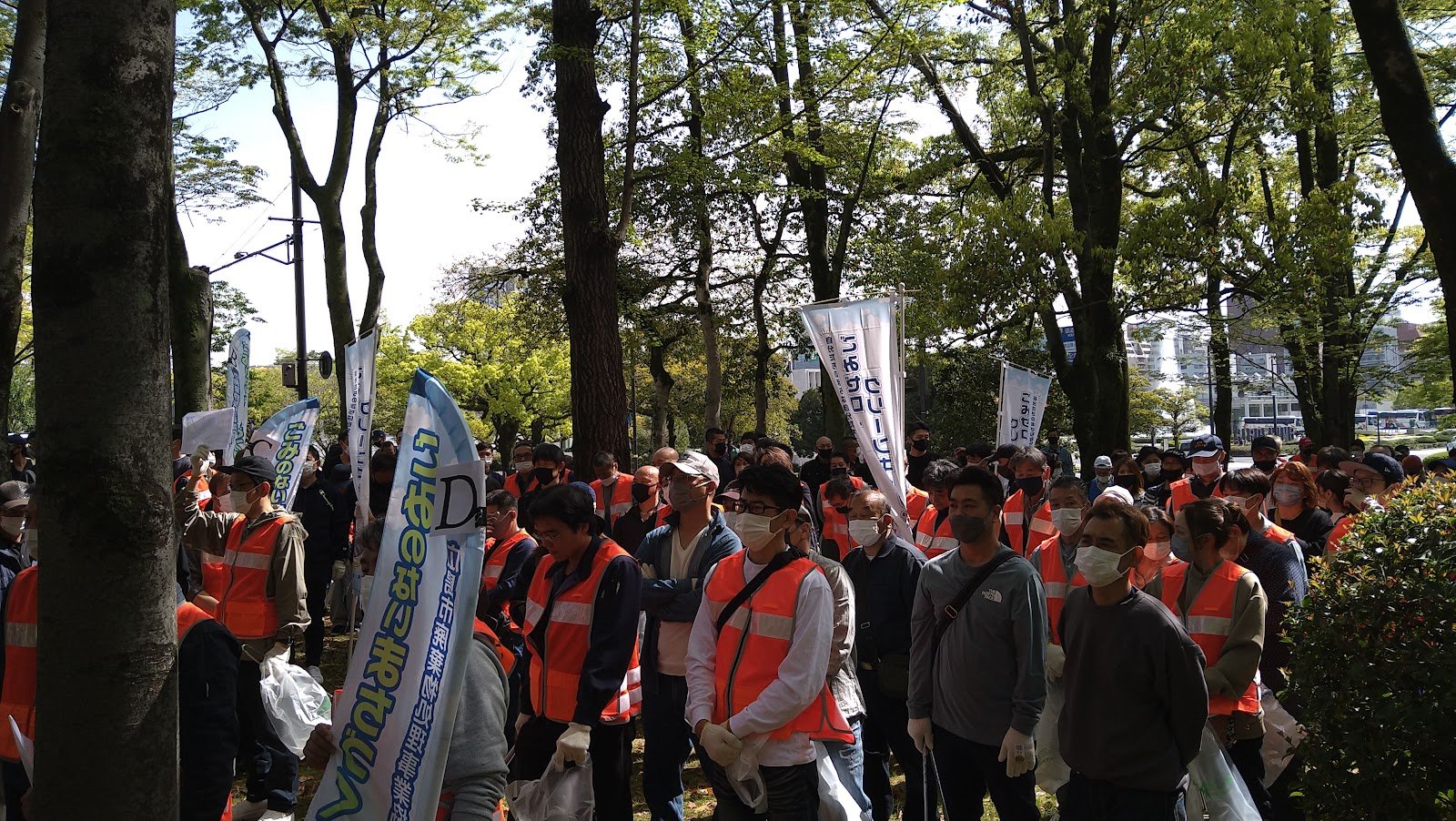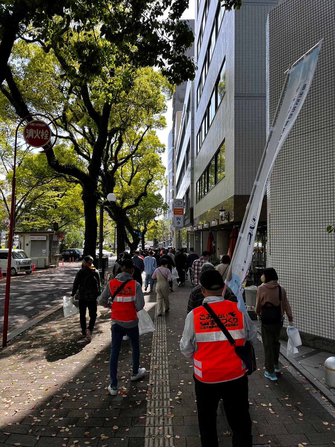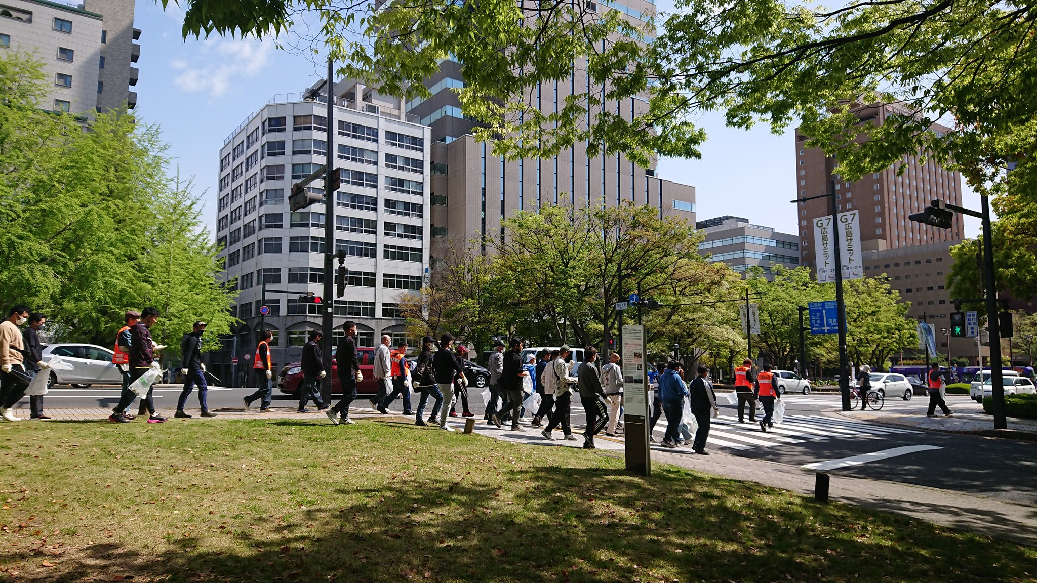 心地よく過ごしていただけるよう平和公園前の緑地帯、吉島通り、元安川の川土手を総勢300人の組合員の方々が4コースに分かれて清掃活動を行いました