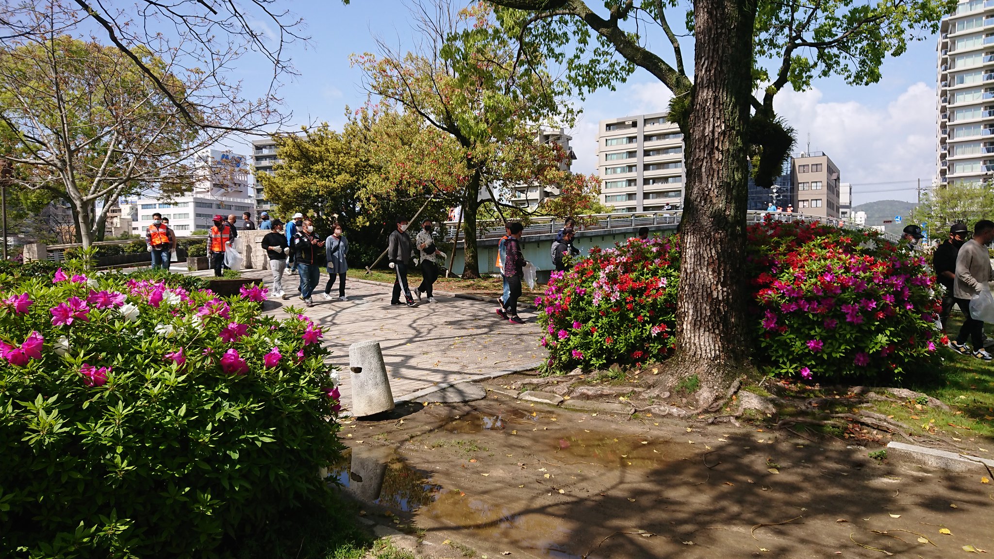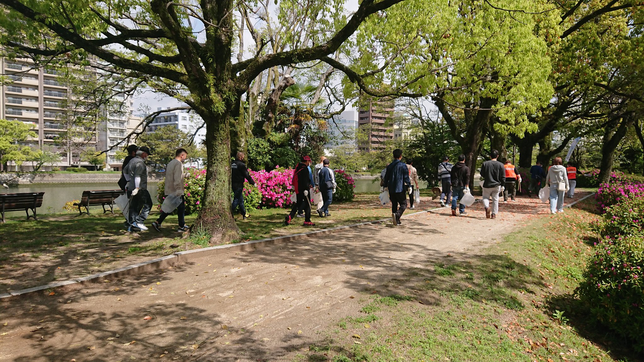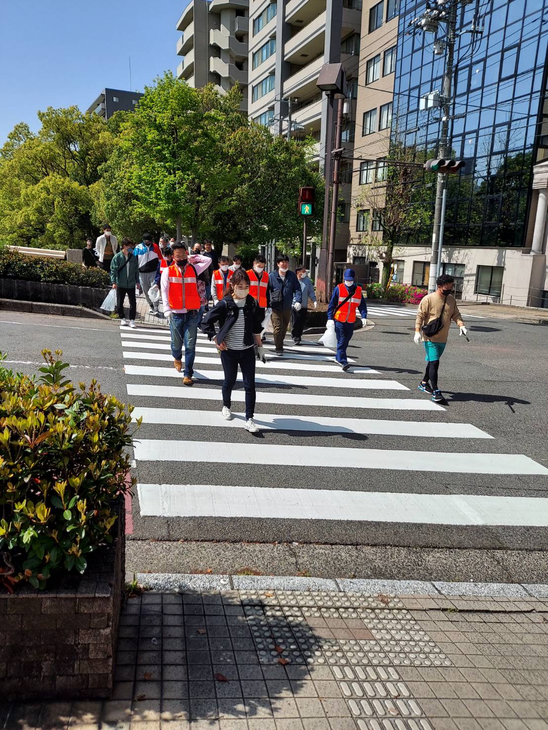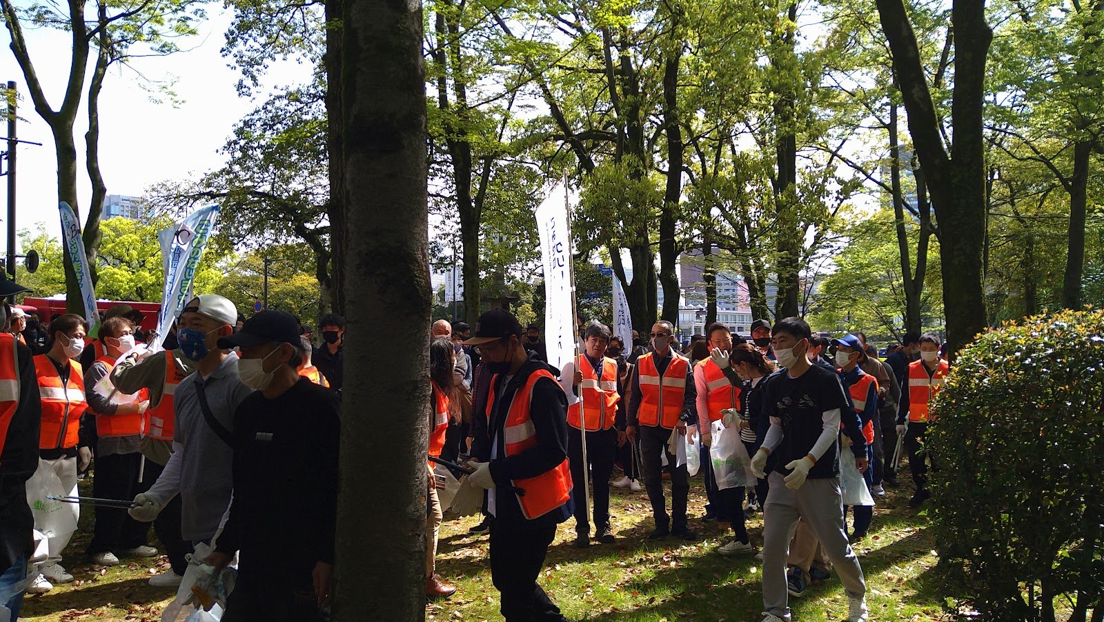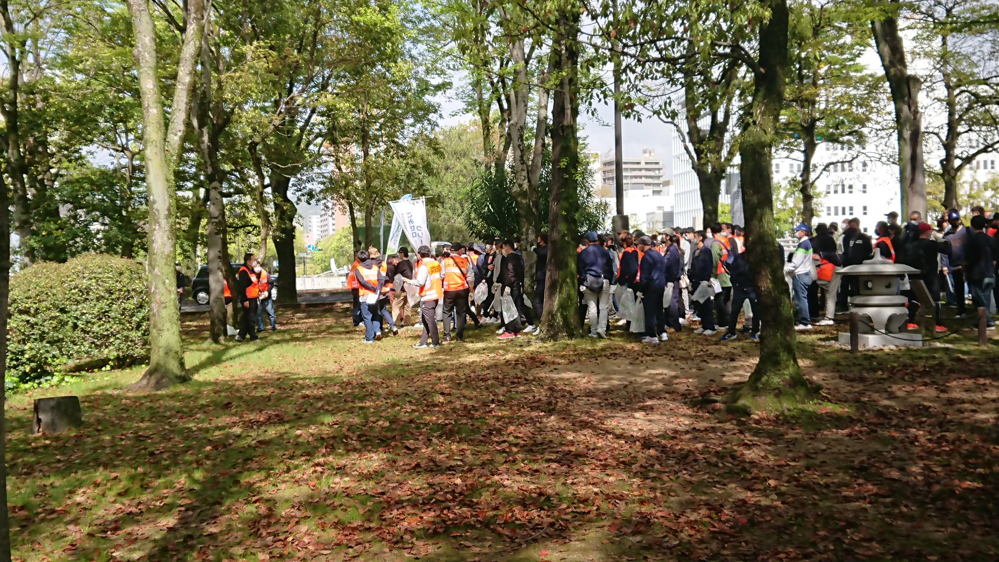 心地よく過ごしていただけるよう平和公園前の緑地帯、吉島通り、元安川の川土手を総勢300人の組合員の方々が4コースに分かれて清掃活動を行いました